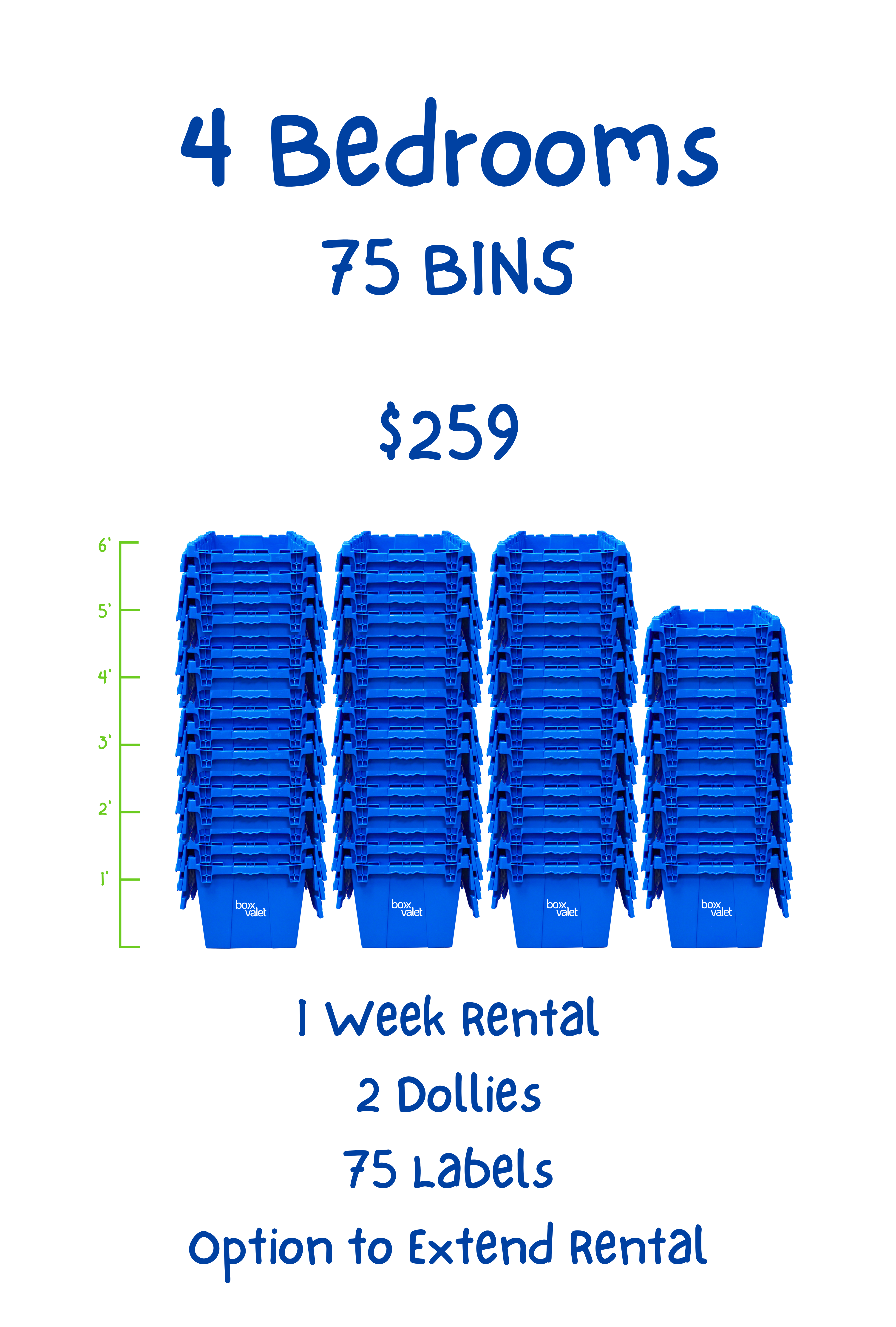 We rent reusable plastic moving boxes that are durable, stackable, and easy to carry—built to make packing faster and moving day smoother. Book online in advance (no walk-ins), pick up your bins, move, and return them back when you’re done.